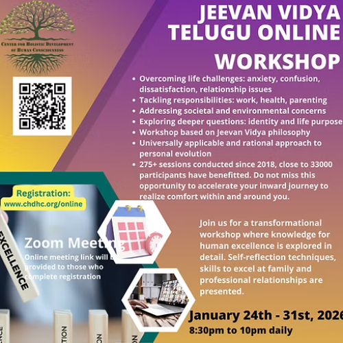 Join an 8-day Online Jeevan Vidya Workshop in Telugu from 12–19 July 2025, daily 6:30–8:00 am on Zoom, to discover your life purpose, overcome stress and fear, and build harmonious relationships with family, society, and nature.